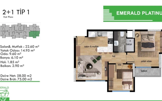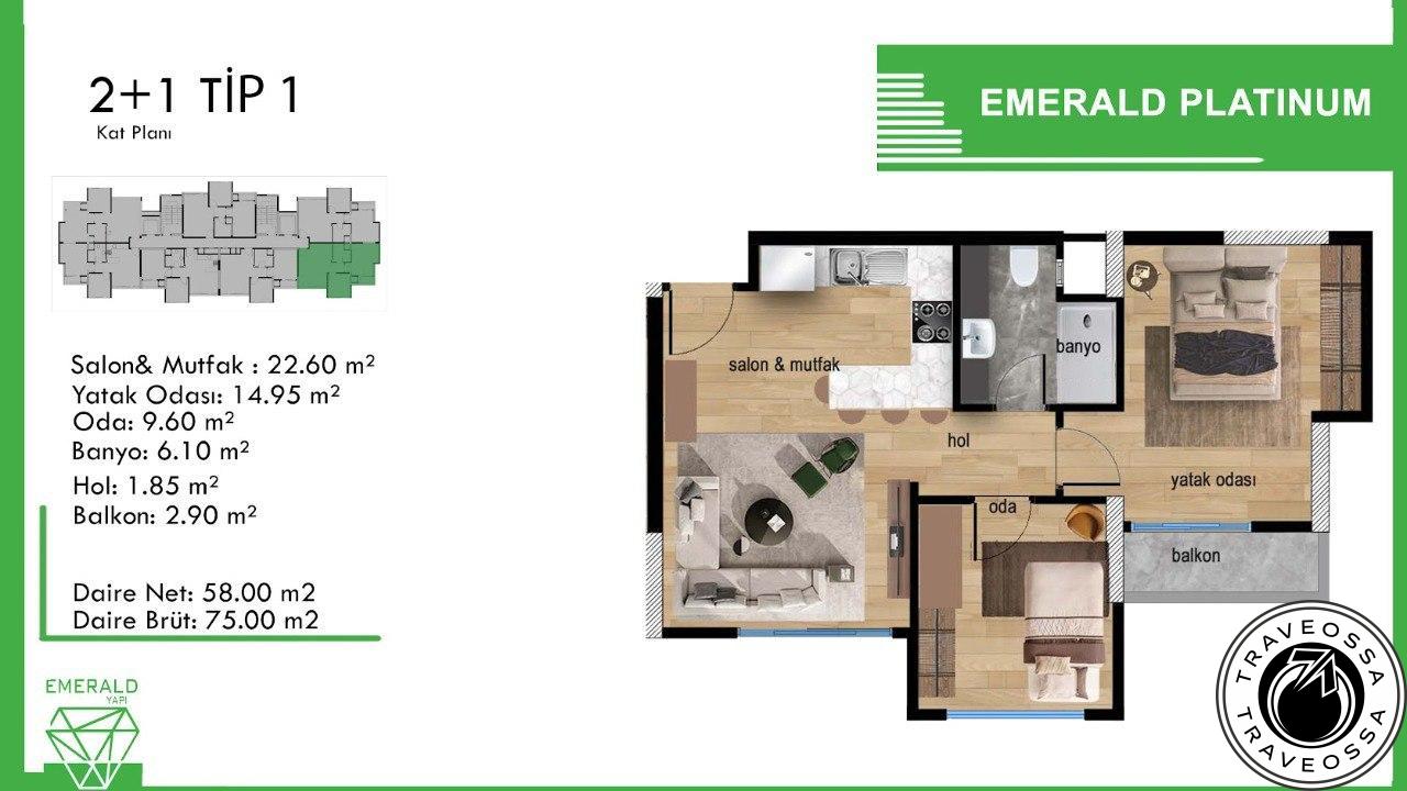 Discover upscale coastal living at Emerald Platinum in Soli, Mezitli. This bright 2+1 unit features efficient central heating, full-cycle generator backup and premium finishes, all within a resort-style complex set to complete in Q2 2025. Ideal as a family home or investment.
